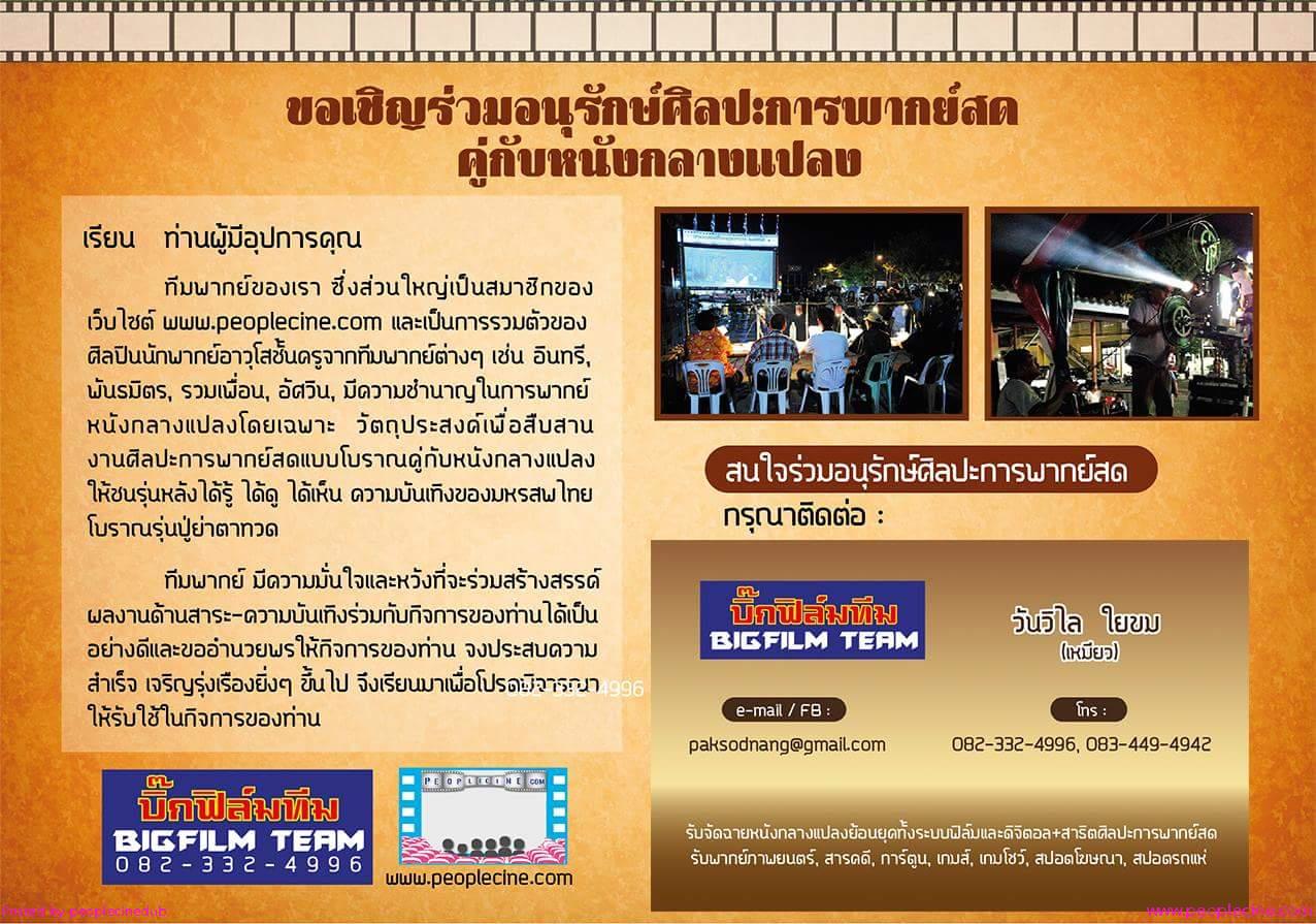 แฟนหนังกลางแปลง พากย์สด เตรียมพบกับผลงานของบิ๊กฟิล์มทีม ในเทศกาลลอยกกระทง 3-4-5 พ.ย. 2560 นี้....สถานที่จะแแจ้งในทราบอีกกครั้งค่ะ